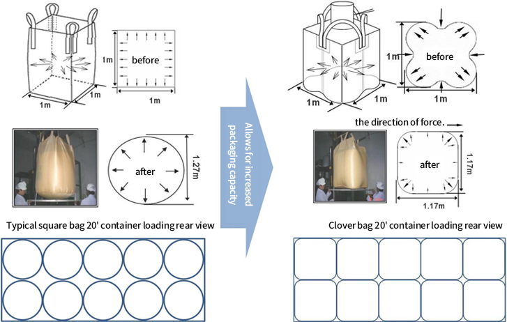Clover bags maintain an upright position thanks to their four pillars, ensuring stability when stacked in multiple layers.